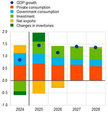 Annual real GDP growth is projected to average 1.3% over the projection horizon, supported by real disposable income growth, receding uncertainty, robust foreign demand, and fiscal stimulus related to defence and infrastructure spending. This fiscal stimulus, mostly accounted for by Germany, should provide a boost to euro area GDP growth in the medium term, which is assessed to cumulatively amount to 0.5% by 2028, with the highest impact on growth expected in 2026-27 (Chart 2).[9] An estimated slight dip in real GDP growth, from 1.4% in 2025 to 1.2% in 2026, is seen to be the consequence of lower carry-over effects in 2026 following the expected somewhat more modest growth in the second half of 2025. Driven by strengthening carry-over effects, annual real GDP growth is projected to increase thereafter and stabilise at 1.4% in 2027-28, reflecting similar carry-over and within-year contributions in these two years. When using modified domestic demand for Ireland instead of Irish GDP, euro area real GDP growth is seen to rise more gradually, increasing from 1.0% in 2025 to 1.1% in 2026 and to 1.3% in both 2027 and 2028.