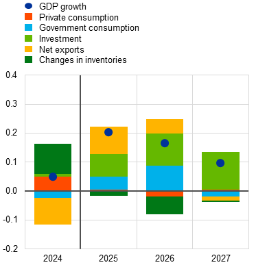 Compared with the September 2025 projections, real GDP growth has been revised up by 0.2 percentage points for 2025 and 2026 and by 0.1 percentage points for 2027 (Chart 3, panel b). The upward adjustment for 2025 reflects revisions to past data, including the better than expected outturn for the third quarter of 2025. The somewhat lower trade policy uncertainty, stronger foreign demand and lower energy commodity prices have led to the upward revision to the growth outlook for 2026. Marginally stronger quarterly dynamics and a larger carry-over effect from the stronger growth momentum in 2026 together entail a small upward revision to the outlook for 2027. In terms of expenditure components, the largest upward revisions for 2025-27 relate to investment and, in particular, stronger business investment over the whole horizon and more dynamic government investment in 2027, as well as stronger government consumption in 2025-26. Net trade has also been revised up for 2025, reflecting the better than expected performance of exports in the first three quarters of the year.