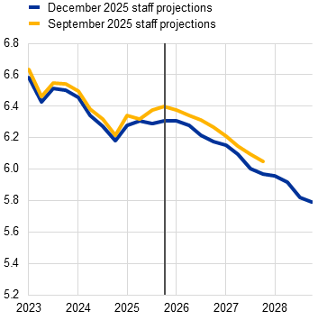 Inflation is projected to decrease from 2.1% in 2025 to 1.9% in 2026 and then to 1.8% in 2027, before rising to the ECB’s medium-term target of 2% in 2028. The expected decline in headline inflation (as measured by the Harmonised Index of Consumer Prices – HICP) at the start of 2026 reflects a downward base effect stemming from energy prices, while inflation in non-energy components should continue to ease throughout 2026. The contribution of energy inflation to headline inflation is expected to remain muted up to late 2027, before increasing notably in 2028 driven by the expected implementation of the EU Emissions Trading System 2 (ETS2), with an upward impact of 0.2 percentage points on headline inflation. HICP inflation excluding energy is expected to fall from 2.5% in 2025 to 2.2% in 2026 and to 2.0% in 2027 and 2028. Food inflation is projected to drop noticeably as the effects of prior price increases in global food commodities and adverse weather conditions over the summer subside, and is seen to stabilise at rates somewhat above 2% as of late 2026. HICP inflation excluding energy and food (HICPX) is projected to moderate from 2.4% in 2025 to 2.0% in 2028 as services inflation declines amid easing labour cost pressures, and as the past appreciation of the euro feeds through the pricing chain, curbing goods inflation. Wage growth should continue to moderate through 2026, before stabilising at around 3%, underpinned by a resilient labour market and productivity growth just slightly below 1%. Unit labour cost growth is expected to ease, although the impact on inflation is seen to be partly offset by a gradual recovery in profit margins over the projection horizon. Compared with the September 2025 projections, the outlook for headline HICP inflation has been revised up by 0.2 percentage points for 2026, reflecting recent data surprises for HICP inflation and wage growth, with the latter leading to a notable upward revision to the wage outlook. The projection for HICP inflation has been revised down slightly for 2027 as a result of an assumed lower contribution from energy inflation, since the implementation of ETS2 is now expected to be postponed from 2027 to 2028, although this contribution is seen to be partly offset by stronger services inflation.