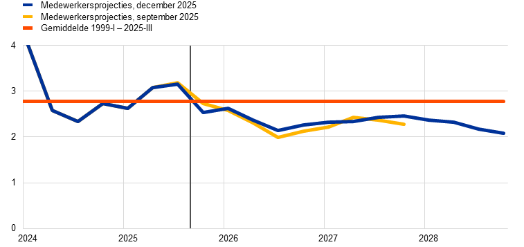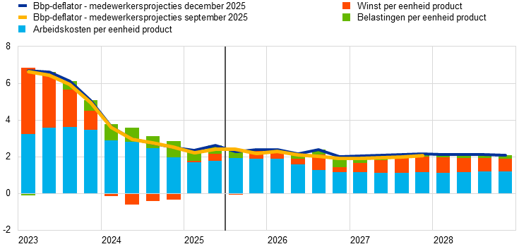 De inflatie zal naar verwachting dalen van 2,1% in 2025 naar 1,9% in 2026 en vervolgens naar 1,8% in 2027, alvorens in 2028 te stijgen naar de doelstelling van de ECB van 2% op middellange termijn. De verwachte daling van de totale inflatie (gemeten aan de hand van de geharmoniseerde consumptieprijsindex (HICP)) begin 2026 weerspiegelt een neerwaarts basiseffect van de energieprijzen, terwijl de inflatie in de niet-energiecomponenten gedurende 2026 zou moeten blijven afnemen. De bijdrage van de energie-inflatie aan de totale inflatie blijft tot eind 2027 gematigd, alvorens in 2028 aanzienlijk te stijgen als gevolg van de verwachte invoering van het EU-emissiehandelssysteem 2 (ETS2), met een opwaarts effect van 0,2 procentpunt op de totale inflatie. Volgens de projecties daalt de HICP-inflatie exclusief energie van 2,5% in 2025 naar 2,2% in 2026 en 2,0% in 2027 en 2028. De verwachting is dat de voedselinflatie aanmerkelijk zal dalen naarmate de effecten van de eerdere wereldwijde prijsstijgingen van voedingsgrondstoffen en de ongunstige weersomstandigheden gedurende de zomer afnemen. Vanaf eind 2026 stabiliseert de voedselinflatie zich dan iets boven de 2%. De HICP-inflatie exclusief energie en voedingsmiddelen (HICPX) matigt van 2,4% in 2025 tot 2,0% in 2028, doordat de diensteninflatie daalt tegen de achtergrond van afnemende arbeidskostendruk en naarmate de eerdere appreciatie van de euro doorwerkt in de prijsketen, waardoor de goedereninflatie wordt afgeremd. Verwacht wordt dat de loongroei geheel 2026 gematigd zal blijven, alvorens zich rond 3% te stabiliseren, ondersteund door een veerkrachtige arbeidsmarkt en een productiviteitsgroei net onder de 1%. De groei van de arbeidskosten per eenheid product zal naar verwachting afnemen, hoewel het effect daarvan op de inflatie deels tenietgedaan wordt door een geleidelijk herstel van de winstmarges gedurende de projectieperiode. Vergeleken met de projecties van september 2025 zijn de vooruitzichten voor de totale HICP-inflatie voor 2026 met 0,2 procentpunt naar boven toe bijgesteld vanwege de recente onverwacht hogere cijfers voor de HICP-inflatie en de loongroei. Deze laatste factor heeft geleid tot een aanzienlijke opwaartse herziening van de loonvooruitzichten. De projectie voor de HICP-inflatie voor 2027 is licht neerwaarts bijgesteld als gevolg van een veronderstelde lagere bijdrage van de energie-inflatie, aangezien de invoering van ETS2 nu naar verwachting wordt uitgesteld van 2027 tot 2028, hoewel deze bijdrage deels wordt gecompenseerd door een sterkere diensteninflatie.