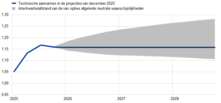 Toelichting: Een stijging impliceert een appreciatie van de euro. Het 25e en het 75e percentiel hebben betrekking op de van opties afgeleide neutrale waarschijnlijkheden voor de USD/EUR-wisselkoers op 26 november 2025.