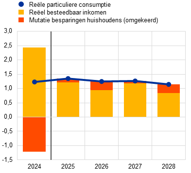 De reële bbp-groei zou verder moeten worden gestimuleerd door de binnenlandse vraag, waarbij de negatieve bijdrage van de netto-uitvoer in 2027-2028 afneemt tot nul. Wat de bestedingen betreft (Grafiek 3, paneel a) geeft de particuliere consumptie gedurende de projectieperiode naar verwachting een sterke groei te zien en levert daarmee de grootste bijdrage aan de reële bbp-groei. De toename van de bestedingen van huishoudens wordt naar verwachting geschraagd door hun stijgende koopkracht, door de robuuste loon- en werkgelegenheidsgroei tegen de achtergrond van een aanhoudend veerkrachtige arbeidsmarkt. Daarnaast zullen de investeringen gedurende de gehele projectieperiode naar verwachting sneller groeien dan het bbp. Private investeringen zullen naar verwachting compensatie bieden voor de vertraging van de overheidsinvesteringen in 2027-2028 als gevolg van het aflopen van de financiering van het programma Next Generation EU (NGEU). Gedurende de projectieperiode zou de investeringsgroei moeten worden gestimuleerd door een afname van de onzekerheid, hogere uitgaven voor defensie en infrastructuur, en aantrekkende winsten en verbeterende vraagomstandigheden door het conjuncturele herstel. Daarentegen zal de groei van de uitvoer, ondanks de aantrekkende buitenlandse vraag, naar verwachting gematigd blijven, aangezien aanhoudende uitdagingen op het gebied van concurrentievermogen van het eurogebied, Amerikaanse heffingen en de eerdere appreciatie van de euro de uitvoercijfers zullen drukken. Dit zal waarschijnlijk leiden tot blijvende verliezen aan marktaandeel bij de uitvoer. Als gevolg daarvan levert de netto-uitvoer in 2025 en 2026 naar verwachting een negatieve bijdrage aan de reële bbp-groei, waarbij de invoer sneller groeit dan de uitvoer. Deze negatieve bijdragen worden volgens de projecties gedeeltelijk gecompenseerd door een positieve bijdrage van de voorraadmutaties in 2025.