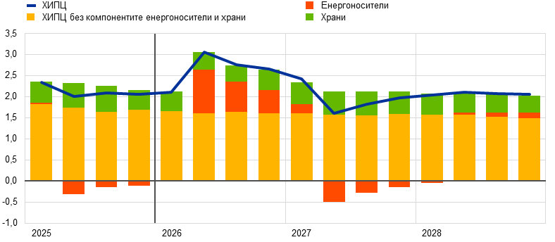 Очаква се инфлацията, измерена чрез Хармонизирания индекс на потребителските цени (ХИПЦ), да нарасне рязко до 3,1% през второто тримесечие на 2026 г. вследствие на скок на инфлацията на енергоносителите поради кризата в Близкия изток, а след това да спадне през третото тримесечие до 2,8% в резултат от понижение на цените на енергийните суровини, заложено в цените на фючърсите. Базовата прогноза предвижда инфлацията на енергоносителите да стане отрицателна през 2027 г., главно поради низходящи енергийни базови ефекти, и след това да се повиши осезаемо през 2028 г., когато се очаква прилагането на схемата на ЕС за търговия с емисии 2 (СТЕ2) да окаже възходящо въздействие от 0,2 процентни пункта върху общата инфлация. Прогнозира се инфлацията на храните да се повишава от края на 2026 г. насетне, когато натискът върху разходите заради скока на енергийните цени намери отражение в потребителските цени на храните, а след това да отслабне през 2028 г. ХИПЦ инфлацията без компонентите енергоносители и храни се очаква да се забави от 2,4% през 2025 г. до 2,1% през 2028 г. Макар че ХИПЦ инфлацията без компонентите енергоносители и храни също се влияе от натиска върху разходите, произтичащ от по-високите енергийни цени, очаква се този ефект да бъде смекчен от известно отслабване на натиска от страна на разходите за труд, поскъпването на еврото в предходния период и навлизането на внос от Китай. Като цяло базовата прогноза предвижда ХИПЦ инфлацията да се повиши от 2,1% през 2025 г. до 2,6% през 2026 г., след което да спадне до 2,0% през 2027 г. и да се увеличи леко до 2,1% през 2028 г. През следващите години нарастването на заплатите ще отслабва, макар и по-бавно от предвиденото в предишните прогнози, поради известни ефекти от компенсирането на инфлацията във връзка със сътресението от енергийните цени. В сравнение с прогнозите от декември 2025 г. перспективата за общата ХИПЦ инфлация е ревизирана нагоре с 0,7 процентни пункта за 2026 г., главно заради енергийния компонент. Тя е ревизирана нагоре с 0,2 процентни пункта за 2027 г. и с 0,1 процентни пункта за 2028 г., тъй като натискът върху разходите, произтичащ от по-високите енергийни цени, ще намери отражение в ХИПЦ инфлацията без компонентите енергоносители и храни и в хранителните компоненти. Енергийният компонент от своя страна е ревизиран леко надолу.