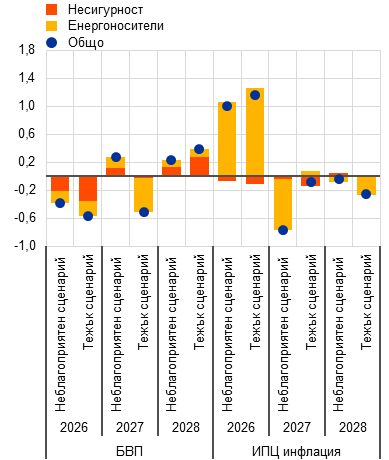 При тежкия сценарий се допуска, че цените на енергоносителите имат по-силно и по-продължително влияние и са придружени от ефекти на повишена несигурност. Прирастът на реалния БВП е с 0,5 и 0,4 процентни пункта по-нисък съответно през 2026 г. и 2027 г., като тримесечните темпове на растеж са отрицателни през второто и третото тримесечие на 2026 г. (Графика 14, панел „a“). Въпреки че енергийното сътресение остава основният фактор, несигурността също играе роля и заедно с глобалните ефекти на пренос засилва този спад. ХИПЦ инфлацията е с 1,8 процентни пункта по-висока през 2026 г. и остава завишена спрямо базовата прогноза с 2,8 процентни пункта през 2027 г. и с 0,7 процентни пункта през 2028 г. Ефектите върху ХИПЦ инфлацията без компонентите енергоносители и храни са по-силни отколкото при неблагоприятния сценарий – с повече от 1 процентен пункт през 2027 – 2028 г.