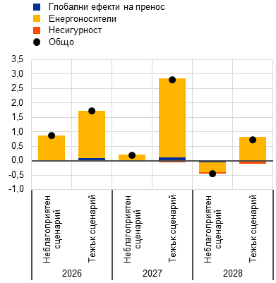 При неблагоприятния сценарий се допуска, че въздействието върху икономиката на еврозоната е временно и част от ефекта върху инфлацията отзвучава предвид преходния характер на сътресенията (Графика 14). Тези ефекти се проявяват основно в намаляване на реалния разполагаем доход, дължащо се на по-високите енергийни разходи, по-слабото външно търсене и по-строгите финансови условия, които по канала на VIX засягат инвестиционните решения. Според симулациите чрез модела ECB-BASE растежът на реалния БВП е с около 0,3 процентни пункта по-нисък през 2026 г. и с близо 0,1 процентни пункта – през 2027 г. спрямо базовата прогноза. С нормализирането на цените на енергията и несигурността растежът на БВП възстановява отчасти загубите и през 2028 г. е с 0,2 процентни пункта над базовата прогноза. Енергийният шок е основният фактор за забавянето, което води най-вече до по-ниско потребление. Принос имат и ефектите на пренос в световен мащаб, които затрудняват износа от еврозоната, и несигурността, която ограничава инвестициите. Общата ХИПЦ инфлация е с 0,9 процентни пункта по-висока през 2026 г. поради по-високите цени на енергоносителите. Предвид доста бързия спад на енергийните цени от високите им нива в този сценарий общата ХИПЦ инфлация е с 0,1 процентни пункта по-висока през 2027 г., но с 0,5 процентни пункта по-ниска през 2028 г. поради дезинфлационния натиск от бързото нормализиране на цените на енергоносителите след 2026 г.