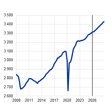 Kotimaisen kysynnän odotetaan saavan tukea meneillään olevasta puolustus- ja infrastruktuurimenoihin liittyvästä finanssipoliittisesta elvytyksestä. Julkisten puolustus- ja infrastruktuurimenojen kumulatiivisen kasvuvaikutuksen arvioidaan olevan 0,5 prosenttiyksikköä, josta suurin osa tulee Saksasta ja jonka arvioidaan olevan voimakkaimmillaan vuonna 2026.[4] Asiantuntija-arvioissa noudatetaan tavanomaisia käytäntöjä, joiden mukaan huomioon otetaan ainoastaan sellaiset finanssipoliittiset toimenpiteet, joista on jo ilmoitettu tai säädetty lailla tai joista todennäköisesti säädetään lailla. Huomioon ei oteta valtioiden mahdollisia tulevia toimenpiteitä, joilla hillitään kriisin taloudellisia vaikutuksia ja joista ovat esimerkkinä energian viimeisimmän hintapiikin jälkeen vuonna 2022 toteutetut toimenpiteet.