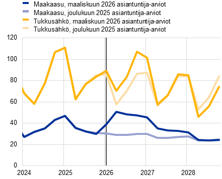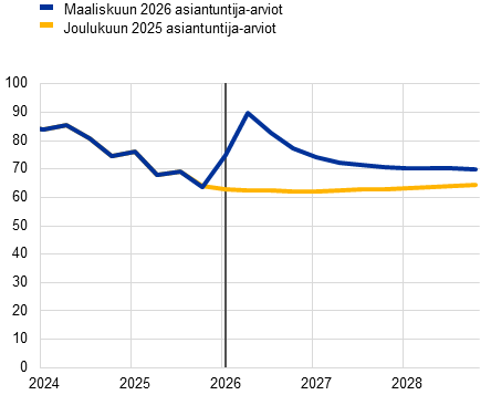 Yhdenmukaistetulla kuluttajahintaindeksillä (YKHI) mitatun inflaation arvioidaan nopeutuvan jyrkästi 3,1 prosenttiin vuoden 2026 toisella neljänneksellä, sillä Lähi-idän kriisi nopeuttaa voimakkaasti energian hintainflaatiota. Kolmannella vuosineljänneksellä inflaation arvioidaan hidastuvan 2,8 prosenttiin, koska energiaraaka-aineiden hintojen oletetaan laskevat futuurihintojen laskun myötä. Asiantuntija-arvioiden perusskenaarion mukaan energian hintainflaatio muuttuu negatiiviseksi vuonna 2027 pääasiassa energian hintakehitykseen liittyvien vertailuajankohdan vaikutusten vuoksi. Energiainflaation arvioidaan nopeutuvan huomattavasti vuonna 2028, jolloin EU:n ETS2-päästökauppajärjestelmän (ETS2) käyttöönoton odotetaan nopeuttavan kokonaisinflaatiota 0,2 prosenttiyksikköä. Elintarvikkeiden hintainflaation arvioidaan nopeutuvan vuoden 2026 lopulta lähtien, kun energian hintapiikkien aiheuttamat kustannuspaineet välittyvät elintarvikkeiden kuluttajahintoihin. Vuonna 2028 sen arvioidaan vaimenevan. Energian ja elintarvikkeiden hinnoista puhdistetun YKHI-inflaation arvioidaan maltillistuvan siten, että se on 2,4 % vuonna 2025 ja 2,1 % vuonna 2028. Energiahintojen noususta johtuvat kustannuspaineet vaikuttavat myös tähän YKHI-inflaatioon, mutta työvoimakustannuspaineiden lievän vähenemisen, euron aiemman vahvistumisen ja Kiinan tuonnin penetraation arvioidaan vaimentavan tätä vaikutusta. Perusskenaarion mukaan YKHI-inflaatio ensin nopeutuu vuoden 2025 aikaisesta 2,1 prosentista 2,6 prosenttiin vuonna 2026. Sitten se hidastuu 2,0 prosenttiin vuonna 2027 ja nopeutuu jälleen vuonna 2028, jolloin sen arvioidaan olevan 2,1 %. Palkkojen kasvu maltillistuu tulevina vuosina, tosin edellisissä asiantuntija-arvioissa ennakoitua hitaammin. Maltillisemman kasvun syynä ovat energian hintasokkiin liittyvän inflaatiokompensaation vaikutukset. Joulukuun 2025 asiantuntija-arvioihin verrattuna kokonaisinflaation näkymiä on tarkistettu 0,7 prosenttiyksikköä ylöspäin vuodelle 2026 lähinnä kokonaisinflaation energiaerän vuoksi. Arviota energiaerän kehityksestä on tarkistettu ylöspäin 0,2 prosenttiyksikköä vuodelle 2027 ja 0,1 prosenttiyksikköä vuodelle 2028. Syynä on energiahintojen noususta johtuvien kustannuspaineiden välittyminen energian ja elintarvikkeiden hinnoista puhdistettuun YKHI-inflaatioon ja elintarvike-eriin. Energiaerän kehitystä koskevia arvioita on tarkistettu sen sijaan jonkin verran alaspäin.