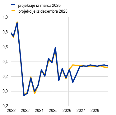 Vseeno so bili zaradi vojne na Bližnjem vzhodu kratkoročni obeti za rast popravljeni navzdol, saj bosta energetski cenovni šok in povečevanje negotovosti najverjetneje prizadela kupno moč gospodinjstev ter zaupanje potrošnikov in podjetij. Tehnične predpostavke, ki pogojujejo projekcije, odražajo pričakovanje, da bo konflikt na Bližnjem vzhodu razmeroma omejen, in nakazujejo, da bi bil neugoden vpliv skoncentriran v kratkoročnem obdobju. Te predpostavke so povezane z zelo veliko negotovostjo, zato je treba posebno pozornost nameniti alternativnima scenarijema (glej razdelek 3). V sedanjih osnovnih projekcijah se predvideva bolj umirjena dinamika potrošnje in naložb v drugem in tretjem četrtletju 2026, kot je bilo sprva pričakovano. Vseeno naj bi povečevanje realnega dohodka ob odpornih trgih dela in zvišanje javnofinančnih spodbud še naprej podpirala rast. Četrtletna rast naj bi se znižala z 0,3% v prvem četrtletju, na katerega vojna predvidoma ne bo imela posebnega vpliva, in bo v drugem četrtletju znašala 0,1% in v tretjem četrtletju 0,2% (graf 1, slika a). V primerjavi z decembrskimi projekcijami to pomeni popravek navzdol za 0,3 odstotne točke za drugo četrtletje in za 0,2 odstotne točke za tretje četrtletje.