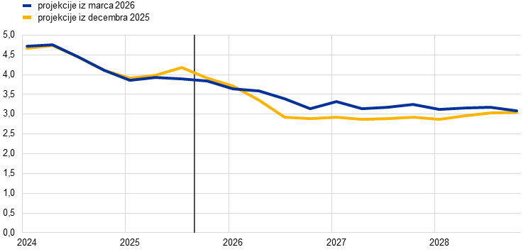 Opombe: Pretekli podatki se lahko razlikujejo od nazadnje objavljenih podatkov Eurostata. Navpična črta označuje začetek sedanjega obdobja projekcij. V grafu niso prikazani razponi negotovosti okrog projekcij. To je posledica dejstva, da standardni izračun pahljačastih grafov (na podlagi napak v preteklih projekcijah) v sedanjih okoliščinah ne bi zanesljivo pokazal velike negotovosti, ki spremlja sedanje projekcije. Za boljšo ponazoritev sedanje negotovosti sta namesto tega v razdelku 3 predstavljena alternativna scenarija, ki predpostavljata različne stopnje resnosti gospodarskih posledic vojne na Bližnjem vzhodu.