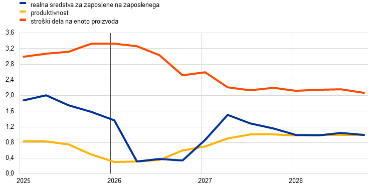 Trg dela bo po projekcijah na splošno ostal odporen, saj bodo podjetja predvidoma kopičila delovno silo v odziv na začasen upad gospodarske aktivnosti zaradi vojne na Bližnjem vzhodu. Rast zaposlenosti se je v letu 2025 znižala po več letih precej močne rasti. Že pred vojno na Bližnjem vzhodu se je predvidevalo, da se bo rast zaposlenosti v letih 2026 in 2027 znižala in se bo tako nadaljevala faza uravnoteženja. V sedanjih razmerah bodo podjetja po pričakovanjih kratkoročno večinoma kopičila delovno silo zaradi negativnega šoka za gospodarsko aktivnost, ki izhaja iz predpostavljenega prehodnega izpada zaradi vojne na Bližnjem vzhodu. Vseeno bi se ta učinek lahko ublažil s pritiski na dobiček, ki izhajajo iz visokih vhodnih stroškov, kar bi omejilo možnosti za kopičenje delovne sile. Gledano v celoti bo rast zaposlenosti v letih 2027 in 2028 predvidoma upadla močneje v primerjavi z decembrskimi projekcijami (graf 4, slika a). Zaradi teh prilagoditev prihaja do kratkoročnih popravkov rasti produktivnosti dela navzdol v primerjavi z decembrskimi projekcijami, ki jih izravnava zvišanje v letih 2027 in 2028. Podobno se bo stopnja brezposelnosti v letu 2026 po pričakovanjih rahlo zvišala, nato pa se bo od leta 2027 dalje zniževala in bo do konca leta 2028 dosegla 6,1-odstotno raven – kar je popravek navzgor v primerjavi z decembrskimi projekcijami (graf 4, slika b).