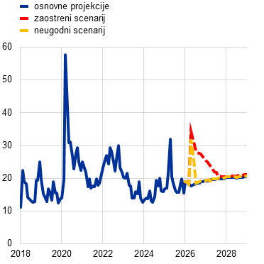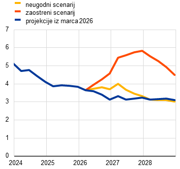 Strokovnjaki ECB so poleg osnovnih projekcij pripravili tudi alternativna, hipotetična scenarija, ki se razlikujeta po predpostavkah o velikosti in vztrajnosti energetskega cenovnega šoka, o njegovem vplivu na mednarodno okolje in negotovost ter o širjenju tega šoka prek posrednih in sekundarnih učinkov na inflacijo. Scenarija ponazarjata alternativna gibanja cen energetskih surovin in njihovo transmisijo v gospodarstvo euroobmočja. Strokovnjaki scenarijema ne pripisujejo stopnje verjetnosti – ampak z njima izpostavljajo glavne negotovosti glede posledic konflikta. Kot je običajno v projekcijah, ta scenarija ponazarjata vpliv na gospodarstvo euroobmočja pod predpostavko, da odziv denarne ali javnofinančne politike ni obsežnejši od odziva, vključenega v osnovne projekcije. Neugodni scenarij vključuje močnejše posredne in sekundarne učinke kot osnovne projekcije, da bi zajel morebitne nelinearnosti pri širjenju začetnega energetskega cenovnega šoka na druge cene v celotnem gospodarstvu. V njem se predpostavlja veliko bolj strmo zvišanje cen energentov ter povečanje negotovosti in obsežnejše prelivanje negativnih posledic v mednarodnem okolju (npr. zmanjšanje zunanjega povpraševanja). Predpostavlja se, da bodo cene nafte in plina v drugem četrtletju 2026 dosegle najvišjo vrednost na ravni 119 USD za sod oziroma 87 EUR/MWh, zatem pa se bodo do tretjega četrtletja 2027 približale osnovnim predpostavkam. Neugodni scenarij v primerjavi z osnovnimi projekcijami nakazuje, da bi bila inflacija v letu 2026 višja za 0,9 odstotne točke in v letu 2027 za 0,1 odstotne točke, v letu 2028 pa bi bila za 0,5 odstotne točke nižja zaradi dezinflacijskih pritiskov, ki izhajajo iz hitre normalizacije cen energentov v tistem letu. Nasprotno bi bila gospodarska rast v letih 2026 in 2027 nižja kot v osnovnih projekcijah, v letu 2028 pa višja. Zaostreni scenarij v primerjavi z neugodnim scenarijem predpostavlja močnejši in vztrajnejši energetski cenovni šok, večjo negotovost ter še močnejše posredne in sekundarne učinke. Predpostavlja se, da bodo v drugem četrtletju 2026 cene nafte dosegle najvišjo vrednost na ravni 145 USD za sod in cene plina na ravni 106 EUR/MWh, zatem pa se bodo zniževale veliko počasneje in bodo v preostanku obdobja projekcij ostale precej višje od predpostavk v osnovnih projekcijah in neugodnem scenariju. V primerjavi z osnovnimi projekcijami bi bila skupna inflacija v obdobju projekcij znatno in vztrajno višja (za 1,8 odstotne točke v letu 2026, 2,8 odstotne točke v letu 2027 in 0,7 odstotne točke v letu 2028). Precejšnja razlika v inflaciji v letu 2028 med neugodnim (1,6%) in zaostrenim scenarijem (2,8%), kot je prikazano v tabeli 1, kaže na ključno vlogo, ki jo imajo potek konflikta, motnje v oskrbi z energijo in velikost mehanizmov širjenja zaradi šoka pri ugotavljanju vpliva na inflacijo v srednjeročnem obdobju. Gospodarska rast bi bila v obdobju 2026–2027 nižja za 0,4–0,5 odstotne točke, nato pa bi se leta 2028 zvišala na raven, ki je 0,5 odstotne točke višja od ravni v osnovnih projekcijah. Zvišanje rasti proti koncu obdobja projekcij odraža predpostavljeno povečanje dohodka in povpraševanja zaradi zvišanja plač v odziv na porast inflacije v predhodnih letih.