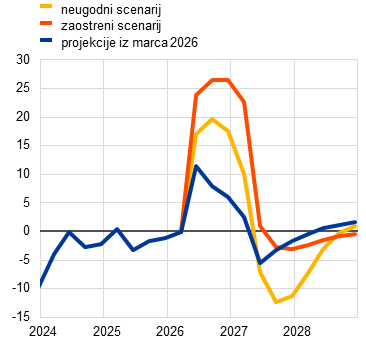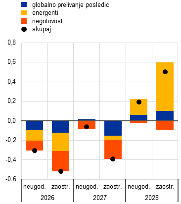 V zaostrenem scenariju se predpostavlja, da bodo imele cene energentov večji in dolgotrajnejši vpliv, spremlja pa jih povečana negotovost. Realna rast BDP je v letih 2026 in 2027 nižja za 0,5 oziroma 0,4 odstotne točke, pri čemer je četrtletna stopnja rasti negativna v drugem in tretjem četrtletju 2026 (graf 14, slika a). Medtem ko ostaja energetski šok glavni dejavnik, ima določeno vlogo tudi negotovost, ki skupaj z globalnim prelivanjem posledic krepi upad. Inflacija je v letu 2026 višja za 1,8 odstotne točke in ostaja povišana, in sicer za 2,8 odstotne točke nad osnovno projekcijo v letu 2027 in za 0,7 odstotne točke nad osnovno projekcijo v letu 2028. Vpliv na inflacijo brez energentov in hrane je večji kot po neugodnem scenariju, in sicer za več kot 1 odstotno točko v letih 2027–2028.