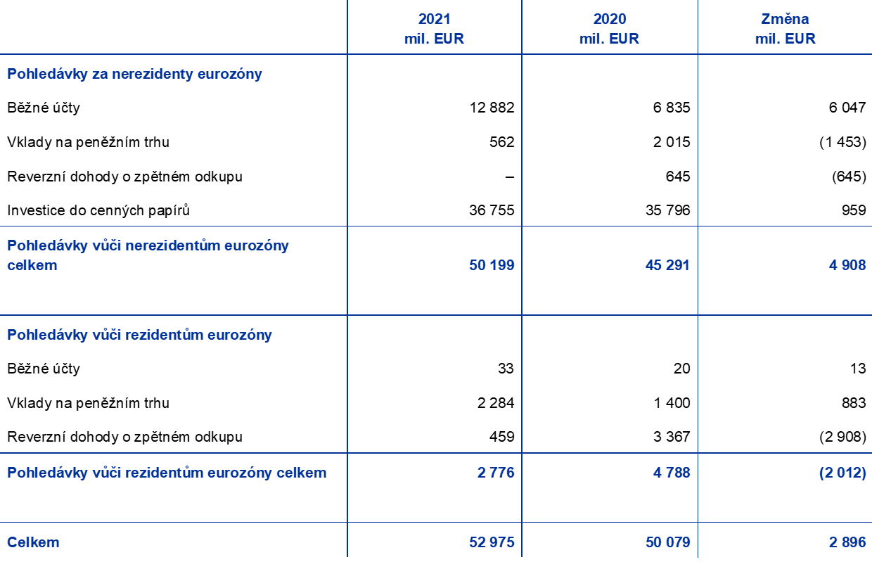 - Tato aktiva jsou zahrnuta pod rozvahovými položkami „pohledávky v cizí měně za nerezidenty eurozóny – zůstatky u bank a investice do cenných papírů, zahraniční půjčky a jiná zahraniční aktiva“ a „pohledávky v cizí měně za rezidenty eurozóny“.