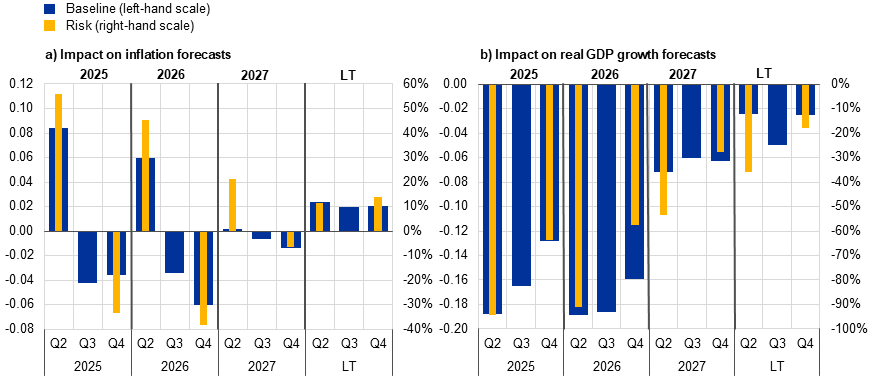In terms of the baseline real GDP growth expectations, tariffs were expected to have a downward impact across all horizons, and in the nearer term (2025 and 2026) in particular (Chart A, panel b, blue line). However, in the latest SPF round the extent of the downward impact was revised to be less negative for both 2025 and 2026.