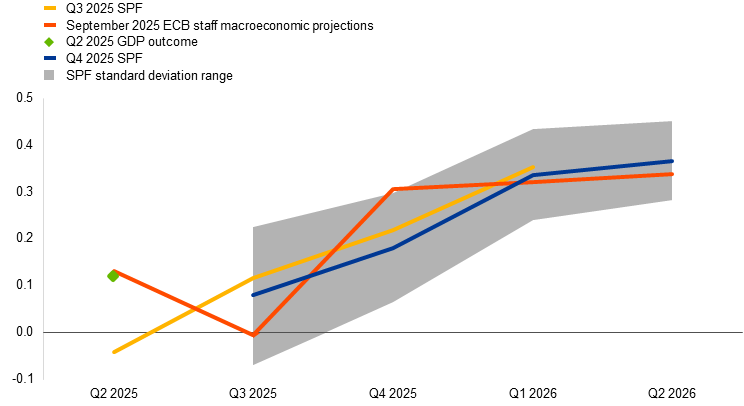 The upward revisions to euro area growth expectations for 2025 were largely driven by new data and revisions to historical data. The upward revisions to the annual growth rate for 2025 stemmed from a stronger than expected growth outturn in the second quarter of 2025, which more than offset a marginally weaker than expected quarterly profile over the remainder of the year (expected growth over the third quarter of 2025 to the first quarter of 2026 was revised down very slightly by a cumulative 0.1 percentage points). Overall, respondents continued to expect real GDP growth to solidify and strengthen over the nearer-term horizons. After the realised growth rate of 0.1%, quarter on quarter, in the second quarter of 2025, respondents expected similar modest growth in the third quarter (Chart 7). Thereafter, respondents expect a gradual strengthening of real GDP growth over the following three quarters. Growth expectations for the first half of 2026 were, on average, broadly in line with the latest ECB staff projections. While the higher US tariffs agreed in the recent EU-US trade deal were expected to negatively affect euro area growth, some respondents noted a decrease in trade policy uncertainty. Over the longer horizon, looser fiscal policy, especially in Germany, and public defence spending were expected to lift GDP growth, counterbalancing the downward impact caused by the tariffs. However, some forecasters were sceptical as to whether the fiscal stimulus would materialise as strongly and as quickly as planned.