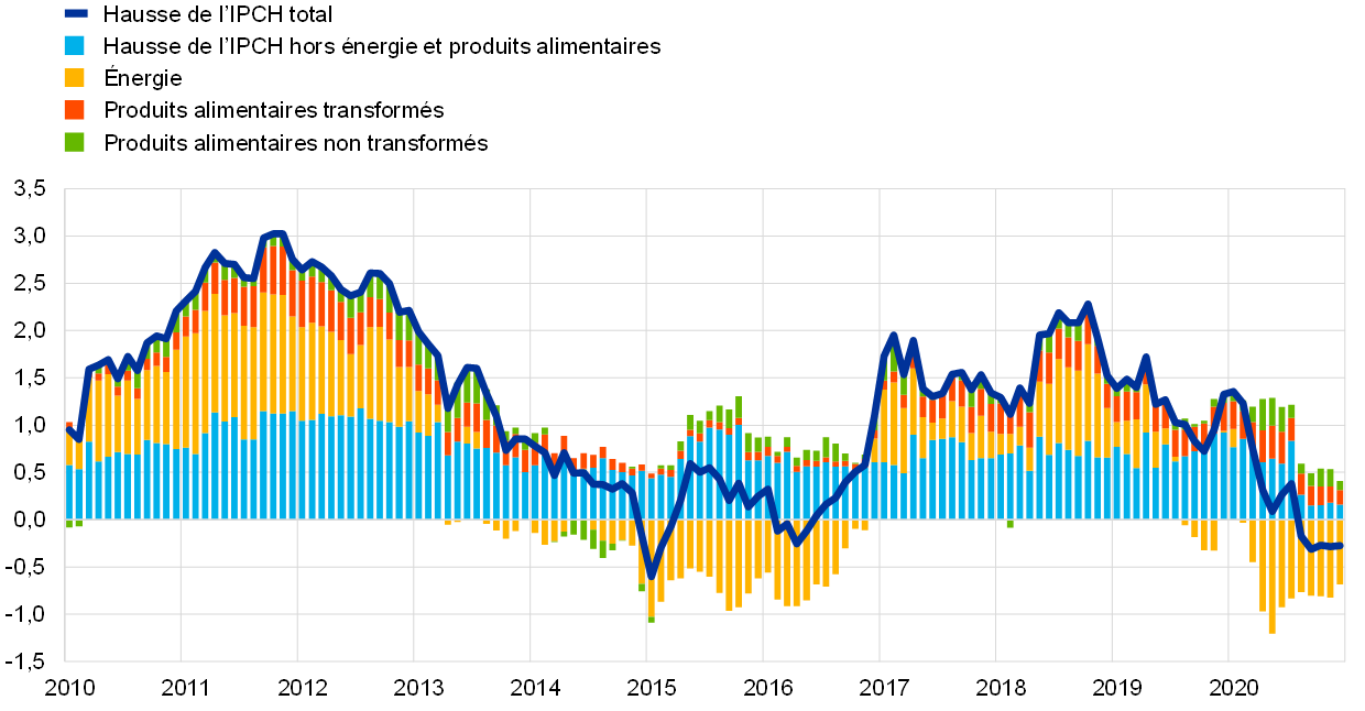 L’évolution de la variation des prix de l’énergie a contribué dans une large mesure à la baisse de l’inflation totale moyenne en 2020 par rapport à 2019, sous l’effet du recul des prix du pétrole enregistré au début de la pandémie. En revanche, la contribution de la hausse globale des prix des produits alimentaires à l’inflation totale mesurée par l’IPCH a légèrement augmenté, ressortant à 0,4 point de pourcentage en 2020, soit légèrement au-dessus du niveau de 2019, reflétant en grande partie la forte accélération de la hausse des prix des produits alimentaires non transformés temporairement observée au cours de la pandémie (avec un pic de 7,6 % en avril 2020) [11].