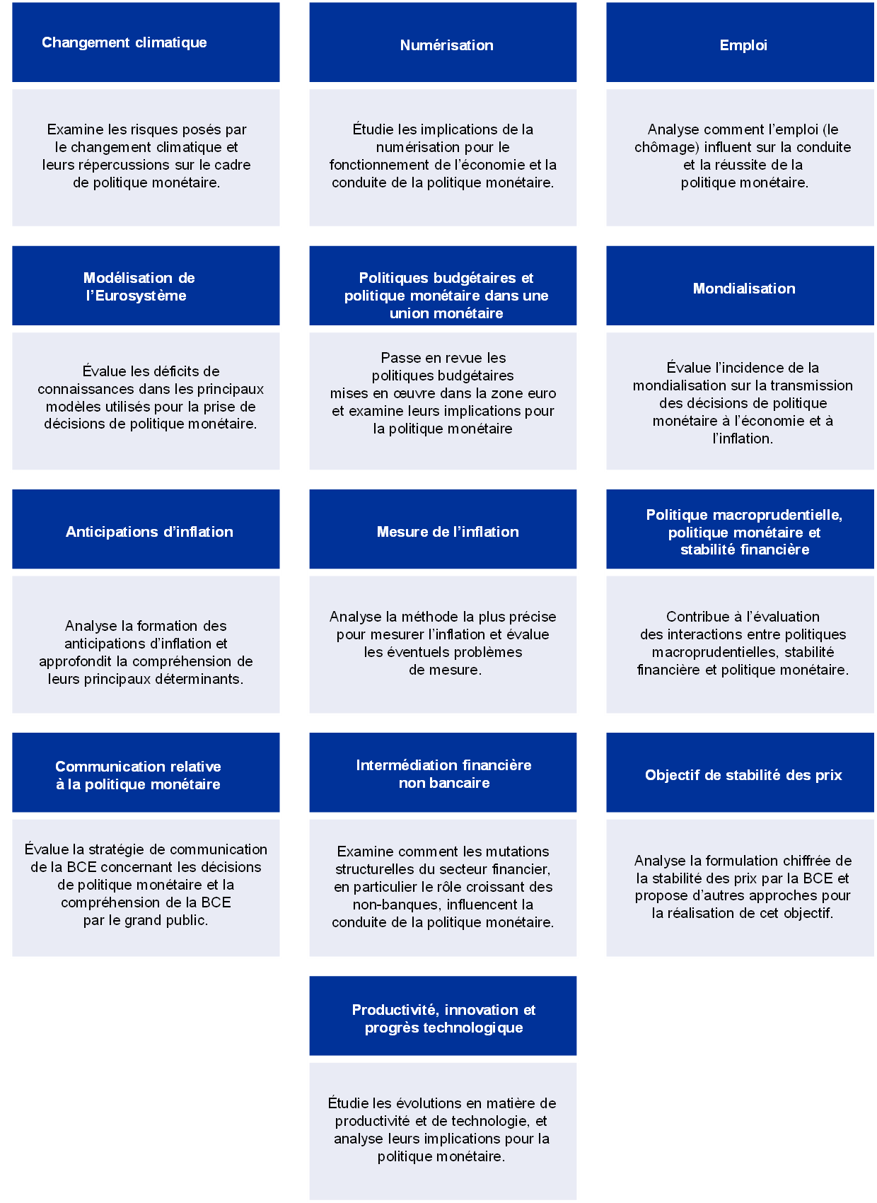En janvier, le Conseil des gouverneurs a lancé une évaluation de la stratégie de politique monétaire de la BCE afin de s’assurer qu’elle continue de servir ses objectifs. Cette évaluation vise à analyser en détail les implications des profonds changements survenus depuis la dernière révision, en 2003, comme la baisse persistante de l’inflation et des taux d’intérêt d’équilibre ainsi que les effets de la mondialisation, de la numérisation et du changement climatique. Devant se terminer au second semestre 2021, elle examinera si la BCE doit ajuster sa stratégie de politique monétaire et selon quelles modalités.