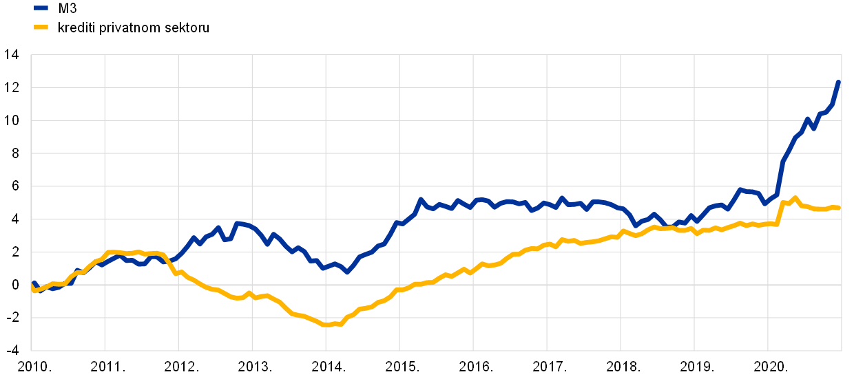 Gospodarstvo europodručja također je bilo pod snažnim nepovoljnim utjecajem pandemije. Taj utjecaj vidljiv je, primjerice, u potrošnji, koja se naglo smanjila u prvoj polovini godine kao posljedica dalekosežnih mjera zatvaranja i povećane nesklonosti riziku. Aktivnost, posebice u sektoru usluga, također je znatno oslabjela zbog nedostatka potražnje i ograničenja aktivnosti. Zbog toga se realni BDP smanjivao iznimno brzim tempom u drugom tromjesečju. Istodobno su nositelji monetarnih i fiskalnih politika djelovali brzo i odlučno kako bi riješili problem urušavanja potražnje i visokih razina neizvjesnosti, među ostalim, osiguravajući povoljne i stabilne uvjete financiranja i kontinuirani pristup likvidnosti. Od početka krize uzrokovane koronavirusom očekivanja glede dubine i trajanja recesije bila su pod velikim utjecajem izgleda za pronalaženje medicinskih rješenja, posebice cjepiva. Uz snažne i koordinirane mjere politike, pozitivne vijesti u kasnu jesen u vezi s napretkom u razvoju cjepiva dovele su do postupne obnove povjerenja. Kretanja rasta ostala su kolebljiva u drugoj polovini godine kada je došlo do novog vala širenja zaraze, a očekivanja glede rasta učvrstila su se i stabilizirala. I kretanja cijena bila su pod snažnim utjecajem pandemije. Zbog posustale potražnje, nižih cijena nafte i oslabljene aktivnosti inflacija mjerena HIPC‑om smanjivala se tijekom godine i bila je na negativnoj razini od kolovoza nadalje. Ostali činitelji, kao što je privremeno smanjenje njemačke stope PDV‑a u drugoj polovini godine, također su doveli do smanjenja inflacije. Istodobno su se izgledi za povećanje inflacije zasnivali na očekivanjima glede solidnog oporavka u 2021. i ukidanja privremenih činitelja, kao što je smanjenje njemačke stope PDV‑a. Odlučnim mjerama politike očuvani su pogodni uvjeti kreditiranja i financiranja te je uvelike poništen utjecaj pooštravanja kreditnih standarda banaka koje je bilo posljedica pogoršanja u okružju rizika. Iako je zbog poremećaja na tržištu nastalih zbog pandemijskog šoka došlo do snažnog pooštravanja financijskih uvjeta u ožujku, brzo djelovanje politike pridonijelo je ukupnom smanjenju prinosa na državne obveznice europodručja u 2020. i postupnom oporavku cijena vlasničkih vrijednosnih papira u europodručju u drugoj polovini godine u odnosu na najniže razine tijekom pandemije. Razdoblje velike neizvjesnosti dovelo je i do ubrzavanja rasta novčane mase i kredita, što je odražavalo snažnu sklonost poduzeća i kućanstava prema likvidnosti i njezino povećanje.