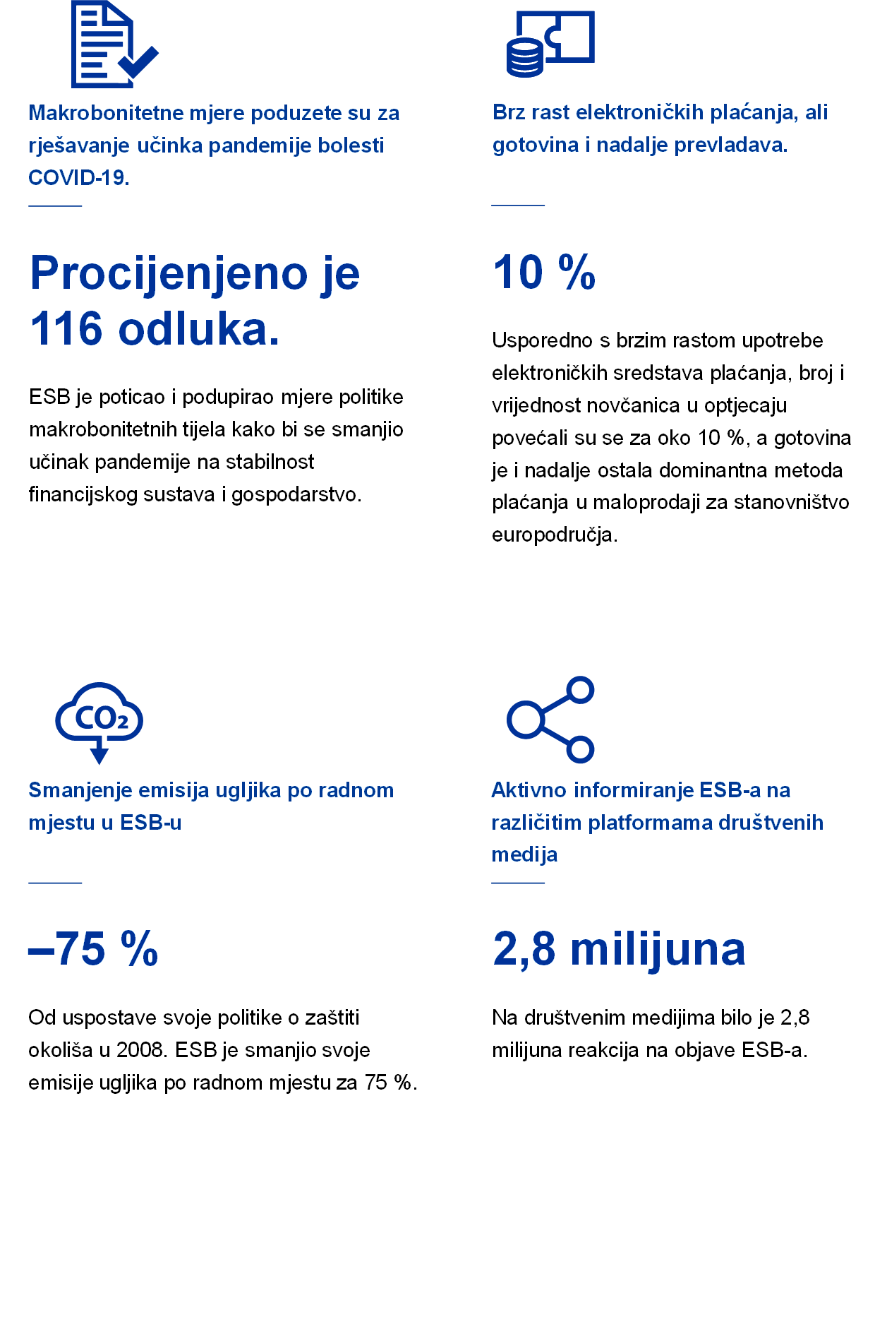 Kako bi neutralizirao negativan učinak pandemije na gospodarstvo europodručja, ESB je znatno ublažio stajalište monetarne politike poduzimanjem sveobuhvatnog skupa mjera koje su prilagođavane tijekom godine. Među tim mjerama bili su uvođenje novoga, privremenoga hitnog programa kupnje zbog pandemije, popuštanje kriterija povezanih s prihvatljivošću imovine i kolateralom te ponuda novih operacija dugoročnijeg refinanciranja. Odgovor monetarne politike bio je ključan za stabiliziranje tržišta i pridonio je umanjenju ozbiljnih rizika za transmisiju monetarne politike, za izglede za gospodarstvo europodručja i, naposljetku, za ESB‑ov cilj stabilnosti cijena, koji su proizišli iz pandemije. Osim toga, makrobonitetne politike bile su usmjerene na održavanje toka kredita prema gospodarstvu, a nadzor banaka ESB‑a donio je mikrobonitetne mjere za ublažavanje učinka krize i promicanje otpornosti europskoga bankarskog sektora.