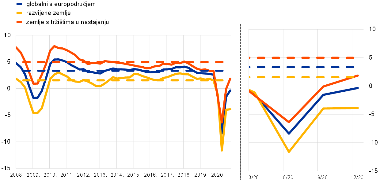 Razvoj pandemije bolesti COVID‑19 zajedno s pratećim mjerama za sprječavanje širenja virusa i potporom politike za ublažavanje gospodarskog učinka pandemije bili su glavne odrednice trenda rasta na globalnoj razini. Globalno gospodarstvo bilo je pogođeno jakim vanjskim šokom, a sve su države odgovorile snažnom potporom politike za ublažavanje gospodarskog učinka pandemije. Nakon što je palo na najnižu razinu u drugom tromjesečju 2020. zbog mjera za sprječavanje širenja virusa, globalno gospodarstvo počelo se oporavljati u trećem tromjesečju, kada je došlo do ublažavanja pandemije i mjera za njezino suzbijanje i kada su se pojavile vijesti o učinkovitim cjepivima. Međutim, drugi val pandemije i ponovno uvođenje strogih mjera za sprječavanje širenja zaraze u nekim razvijenim gospodarstvima znatno su usporili rast u posljednjem tromjesečju godine (vidi Grafikon 1.). U svim velikim zemljama s tržištima u nastajanju tromjesečni rast bio je negativan u prvoj polovini 2020., ali se snažno oporavio u drugom polugodištu.