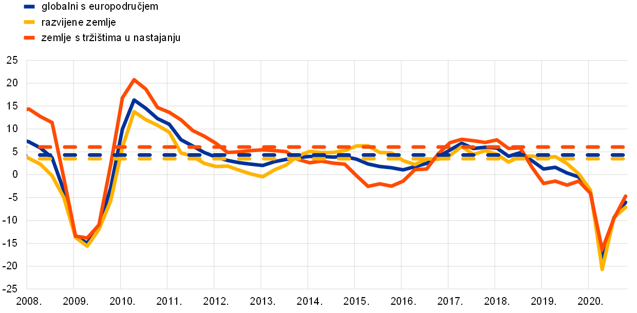 Napomene: Rast globalne trgovine definira se kao rast globalnog uvoza, uključujući europodručje. Pune linije označuju podatke i obuhvaćaju razdoblje do četvrtog tromjesečja 2020. Isprekidane linije označuju dugoročni prosjek (između četvrtog tromjesečja 1999. i četvrtog tromjesečja 2020. Posljednji podatci odnose se na 25. veljače 2021.