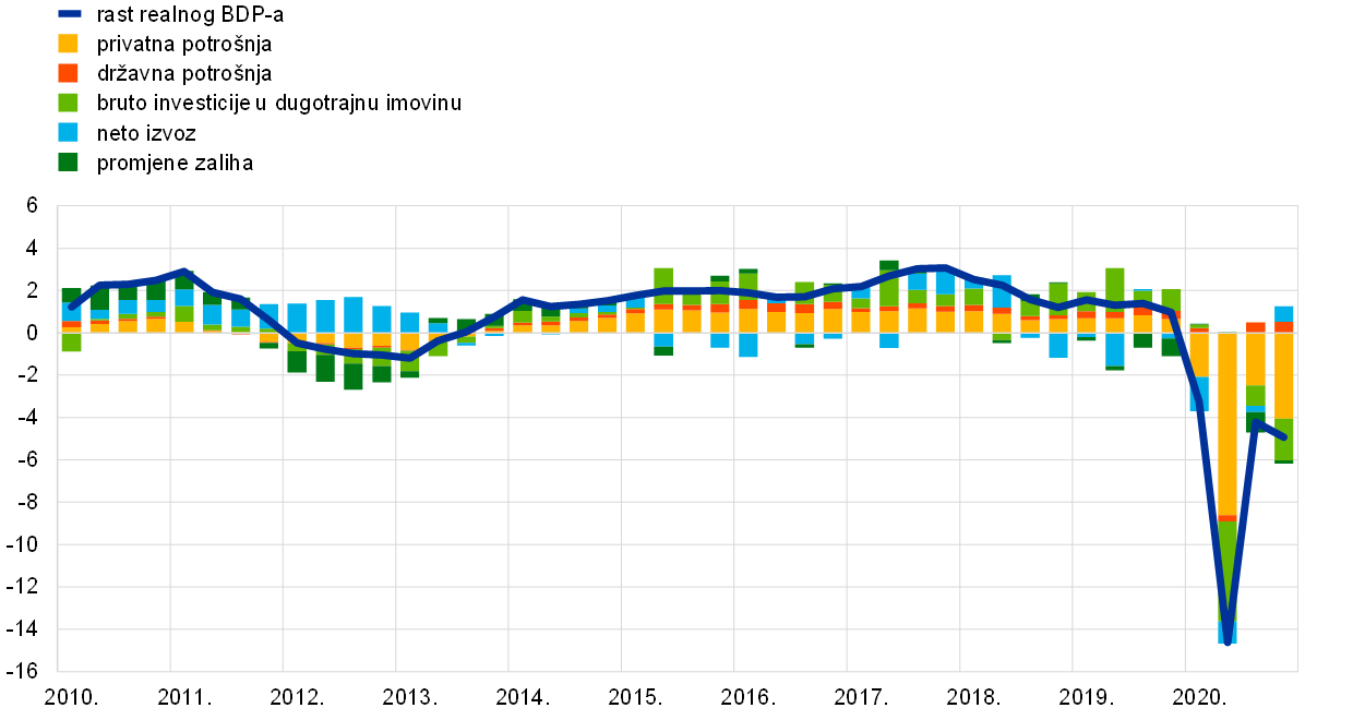 Privatna potrošnja u europodručju smanjila se za 8,0 % u 2020., a posebno je snažno pala u prvoj polovini godine, uglavnom zbog mjera zatvaranja. S obzirom na to da su gubitci realnoga raspoloživog dohotka nastali zbog mjera zatvaranja bili ublaženi znatnim državnim kompenzacijama, pad potrošnje također se ogledao u naglom povećavanju stope štednje. Kako su mjere zatvaranja znatno ublažene u trećem tromjesečju 2020., privatna se potrošnja snažno oporavila, što je, međutim, prekinuto u posljednjem tromjesečju tijekom drugog vala pandemije. Krajem 2020. privatna potrošnja i nadalje je bila ispod razine prije pandemije u okružju udara na tržišta rada i visoke razine neizvjesnosti.