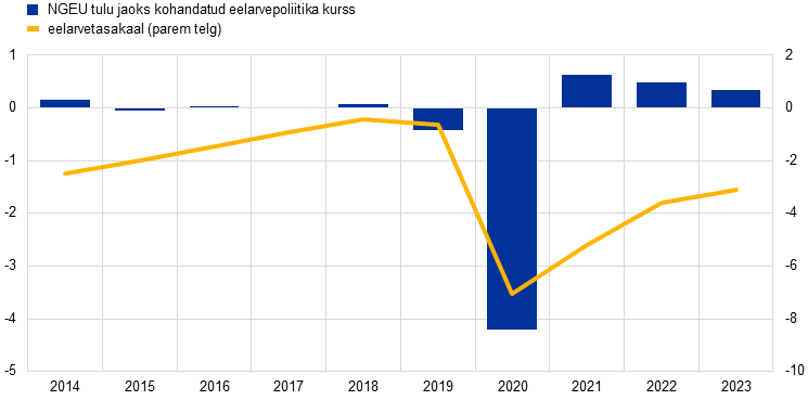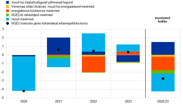 Märkus. Eelarvepoliitika seisundi näitajat kohandatakse alates 2021. aastast tulude poolel taaste- ja vastupidavusrahastust saadud toetuste tasaarveldamise teel, kuna sellel tulul ei ole makromajanduslikku karmistavat mõju. „Muud meetmed“ on peamiselt seotud pandeemia ajal võetud meetmetega ja nende hilisema lõpetamisega.