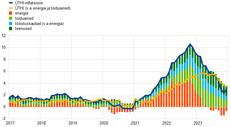 Energiahindade muutused moodustasid rohkem kui poole koguinflatsiooni langusest ajal, mis jäi 2022. aasta detsembri ja 2023. aasta detsembri vahemikku. Energiahindade inflatsioon oli 2023. aasta jaanuaris endiselt kiire, kuid langes aasta lõpuks 25,6 protsendipunkti võrra negatiivsele tasemele. See oli tingitud 2022. aastal toimunud energia hulgimüügihindade järsu tõusu taandumisest. Energiahindade inflatsioon jäi siiski mõnevõrra volatiilseks, sest energia hulgimüügiturud olid sündmustele tundlikud, näiteks Lähis-Ida konflikti suhtes. Samal ajal saavutas toiduainehindade inflatsioon 2023. aasta märtsis tipptaseme: 15,5%. Seejärel aeglustus see märkimisväärselt kogu ülejäänud aasta jooksul, ehkki aasta lõpu poole oli see ikka veel üle 6%. Selle põhjuseks oli varasemate kulušokkide püsiv mõju, mille tingisid muu hulgas energiahinnad ja teised sisendid, ning ühikukasumitest ja tööjõukuludest tingitud tugevam surve.