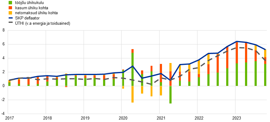 SKP deflaatori ja ÜTHI (v.a energia ja toiduained) vahelised kontseptuaalsed põhierinevused tulenevad asjaolust, et teine neist põhineb kodumajapidamiste tarbitud kaupade ja teenuste müügihindadel kaasatud kategooriates olenemata sellest, kas neid toodetakse euroalal või imporditakse, samal ajal kui SKP deflaator hõlmab kõigi euroala majanduse toodetud toodete lisandväärtuse hindu ega arvesta vahetarbimise panust lõpphindadesse. Vt EKP majandusülevaate 4/2023 infokast „Kuidas on kasum ühiku kohta mõjutanud euroalasisese hinnasurve hiljutist tugevnemist?“.