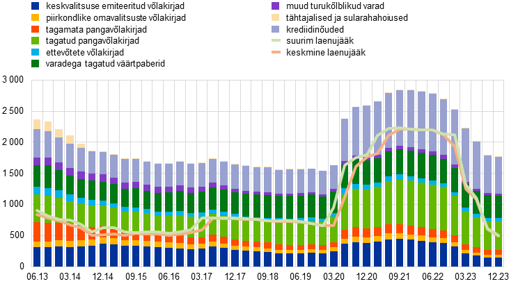 Samal ajal jätkasime eurosüsteemi bilansi normaliseerimist, et tagada selle püsiv vastavus rahapoliitika üldisele kursile. Eurosüsteemi bilansi maht kahanes 2023. aastal rohkem kui 1 triljoni euro võrra, kusjuures suur osa langusest oli tingitud meie suunatud pikemaajaliste refinantseerimisoperatsioonide aegumistähtaegade saabumisest ja ennetähtaegsetest tagasimaksetest. Aasta edenedes lõpetasime ka reinvesteeringute tegemise EKP varaostukava raames. Detsembris teatasime, et pandeemia majandusmõjude ohjeldamise erakorralise varaostukava raames tehtavad reinvesteeringud lõpetatakse järk-järgult.