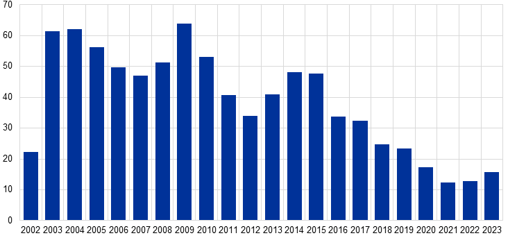 EKP tõstis 2023. aasta jooksul baasintressmäärasid veel 200 baaspunkti võrra, kergitades hoiustamise püsivõimaluse intressimäära 4%ni. Rahapoliitika karmistamine kandus jõuliselt üle majandusse. | Euroala pankade esimese taseme põhiomavahendite suhtarv oli kolmandas kvartalis 15,6%. See oli oma kõrgeima taseme lähedal alates Euroopa pangandusjärelevalve loomisest ning kajastas pankade portfellide suuremat kasumlikkust ja riskide maandamist. |