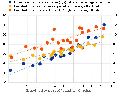 We are also able to examine the possible connection between the broader level of concern about geopolitical risks with consumers’ expectations about their own financial situation. As shown in Chart 3b, we find that that consumers who worry most about geopolitical risks are much more likely to expect a worse overall financial situation for their own household compared with those who are less concerned. Also, they perceive a higher chance of losing their job and an increased risk of a financial crisis.This makes them cautious in their economic decisions. Our findings, therefore, suggest that geopolitical concerns play a role in holding back consumer spending and thereby ultimately drag on growth in the euro area.