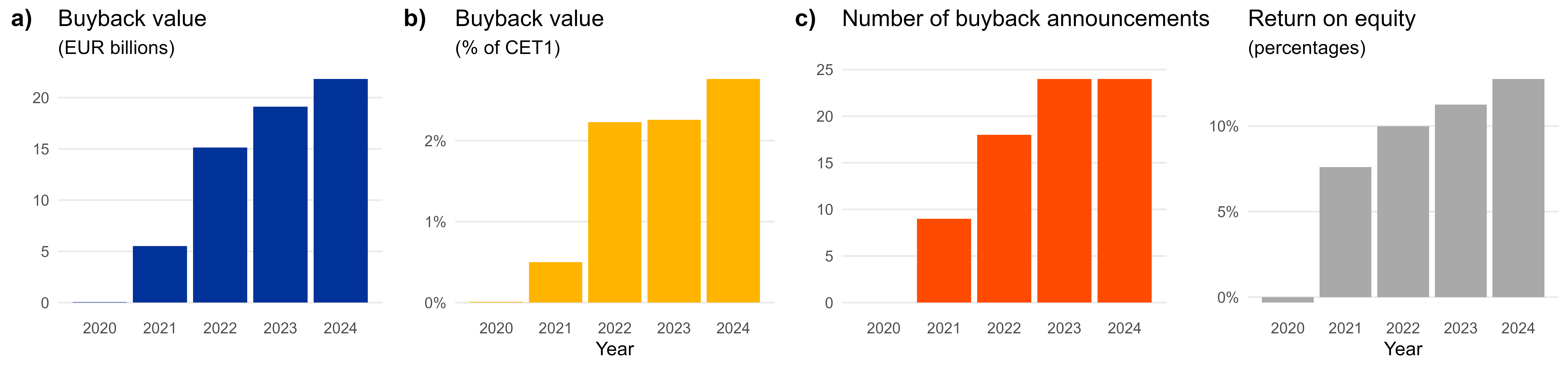 As profits increased over this period, banks steadily expanded the total size of the buyback programmes each year – measured in both absolute and relative terms (Chart 1, panels a) and b). The rise in the value of buybacks also came with more frequent buyback announcements, which increased each year until 2023 (panel c). Finally, the growing magnitude of buybacks has coincided with the increasing bank profitability, illustrated by the rising return on equity (panel d).