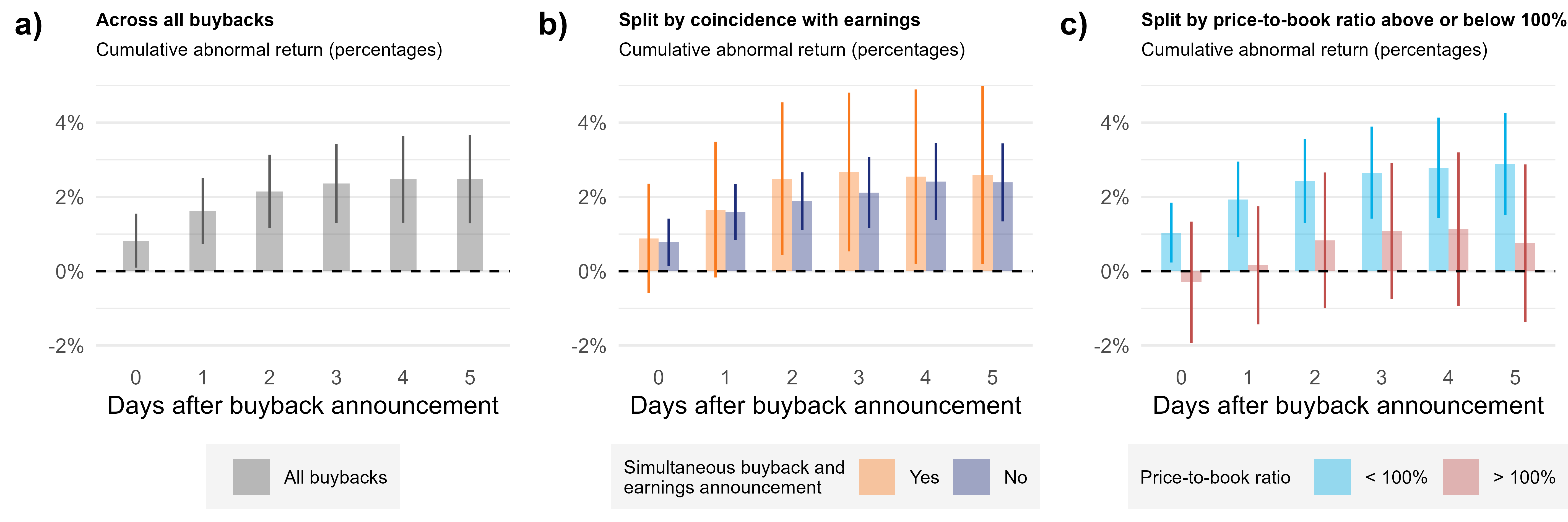 We also found that the effect of buyback announcements depends on the bank’s price-to-book ratio (panel c). As we would expect, the positive impact of buyback announcements on share prices is stronger for banks trading below book value than for those with price-to-book ratios above 100%.