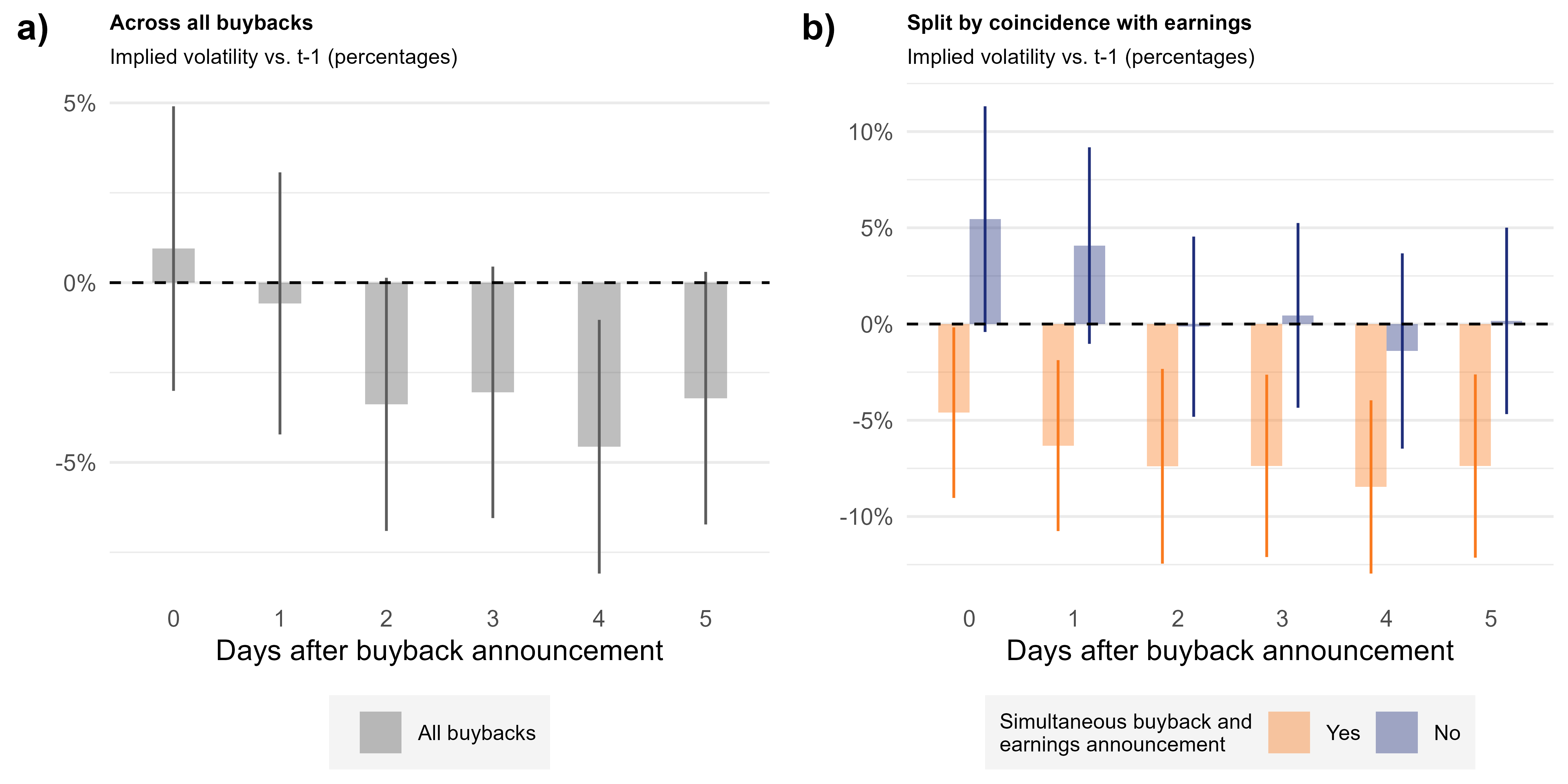 However, when buyback announcements coincide with earnings calls, they are associated with a decline in share price volatility. This effect is consistent with the literature on earnings announcements,[1] which shows a decrease in volatility immediately after an announcement.