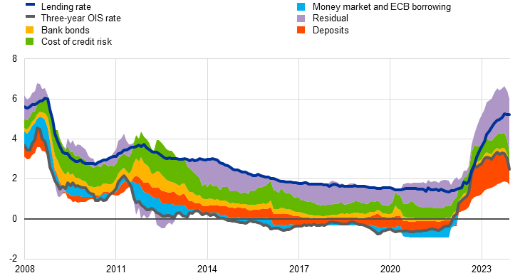 Notes: This chart decomposes the realised lending rate to non-financial corporations (blue line) into contributions from bank cost components. The residual between the realised lending rate and the various cost components identifies a measure of intermediation margin. The costs of deposits, bank bonds and money market and ECB borrowing are expressed as spreads vis-à-vis the base rate, i.e. the three-year overnight index swap rate (black line), weighted by their respective importance in banks’ funding mixes. The latest observations are for December 2023.
