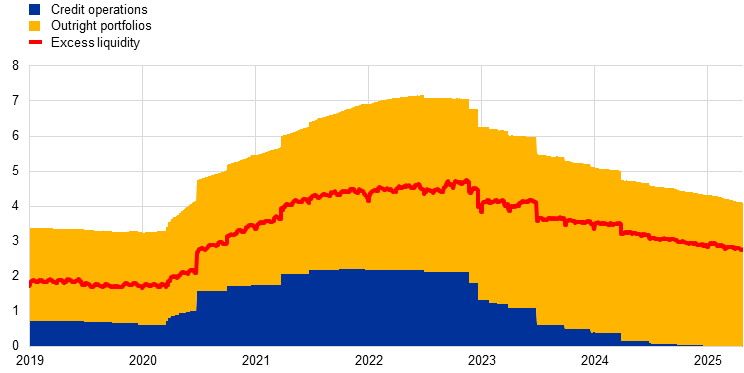 Average excess liquidity in the euro area banking system continued to decline. Liquidity provision decreased, owing to lower Eurosystem holdings under the asset purchase programme (APP) and pandemic emergency purchasing programme (PEPP) following the discontinuation of APP reinvestments at the beginning of July 2023 and PEPP reinvestments at the end of December 2024. The decrease was partly offset by the continuing reduction in liquidity absorption through net autonomous factors.
