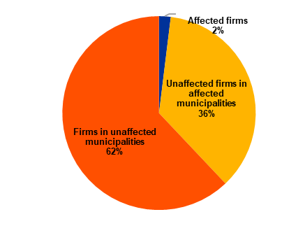 7. A materiality threshold is applied to account for potential errors in geospatial data: a municipality is considered affected if it has at least a few affected firms. The results remain robust to variations in this threshold.