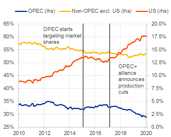 One of the key factors behind the rise in inventories was the initial decision by traditional oil-producing economies to abandon production targets, and hence to put downward pressure on oil prices, in response to the unprecedented surge in shale oil production in the United States that took off at the beginning of the past decade.