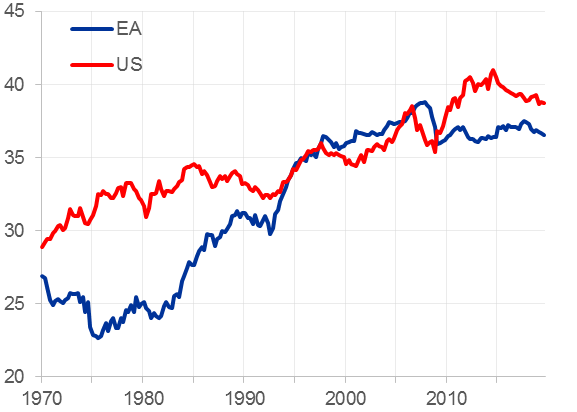 In the euro area, it has increased from an average level of 25% in the 1970s to 37% today, and it has increased by even more than in the United States over this period.