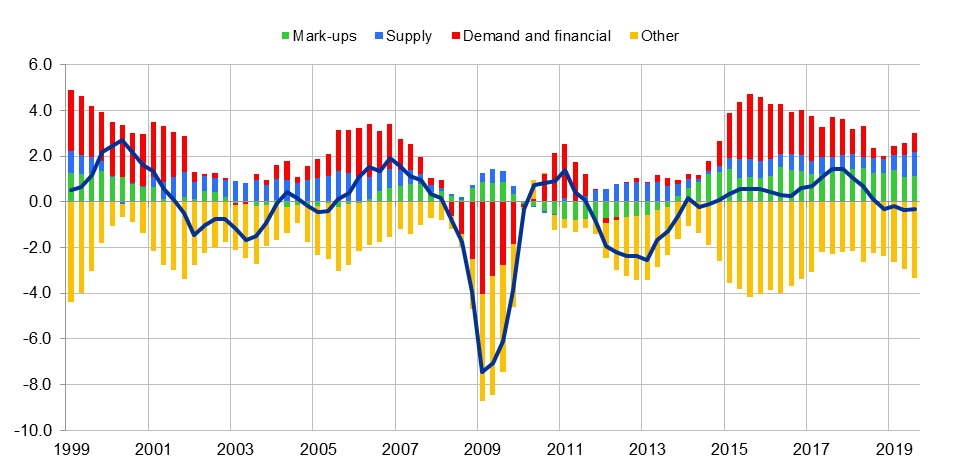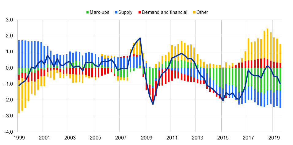 Notes: The chart presents the decomposition of euro area HICP inflation into structural shocks based on the New Area-Wide Model (NAWM) II. The mark-up shock group consists of the shocks to the wage mark-up, the domestic price and export price mark-ups, as well as the import price mark-up. The supply shock group comprises the persistent and the transitory component of the model’s permanent technology shock, and the transitory technology shock. The demand and financial shock group includes the shocks to government consumption, import demand, export demand preferences, monetary policy, as well as the domestic and external risk premium shocks, the shock to the survival rate of the wholesale banks, and the shock to the mark-down parameter of the retail banks. The “Other” shock group comprises the investment-specific technology shock, shocks to foreign variables, measurement errors, and shocks in bridge equations. See Coenen, G., Karadi, P., Schmidt, S. and Warne, A. (2018), “The New Area-Wide Model II: an extended version of the ECB's micro-founded model for forecasting and policy analysis with a financial sector”, ECB Working Paper No 2200.
