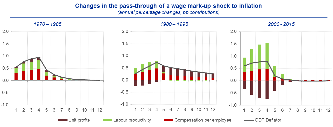 This research analyses the response of the GDP deflator, for three different sub-samples, to a 1% increase in compensation per employee. According to this research, profits only started to take on a measurable buffering role over the past 20 years. In the 1970s, by contrast, profits even slightly increased in the face of a labour cost-push shock.