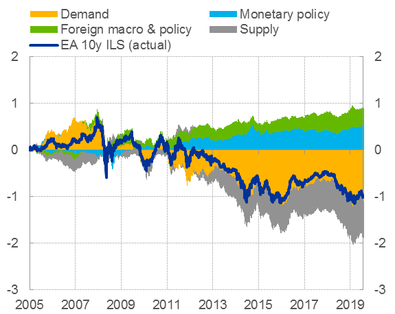 Clearly, according to this methodology, a significant part of the decline in long-term inflation expectations has been due to the weakening in aggregate demand – the yellow area – at the time of the sovereign debt crisis, and again in 2018 on the back of the deterioration in the global growth outlook.