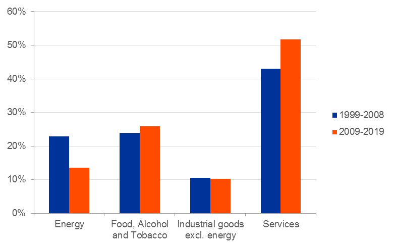 It accounted, on average, for 23% of headline inflation in the ten years from 1999 to 2008.