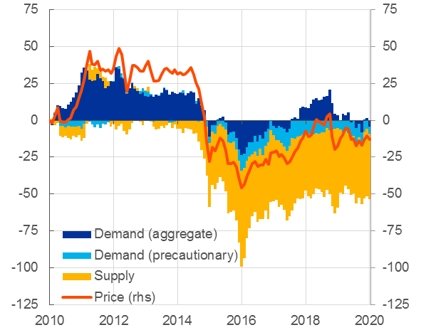 Source: Bloomberg, Haver Analytics, IEA and ECB staff calculations.Notes: The decomposition is derived from a monthly structural BVAR model with sign restrictions. The model decomposes the average Brent spot oil price, global oil production and global economic activity and identifies three shocks: i) aggregate demand shocks are identified by an increase in prices, production and activity; ii) precautionary demand shocks are identified by an increase in prices and production and a decrease in activity; iii) supply shocks are identified by an increase in prices and a decrease in production and activity.