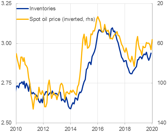 Sources: Bloomberg, IEA and ECB staff calculations.Latest observation: Jan-2020 (spot) and Dec-2019 (inventories).