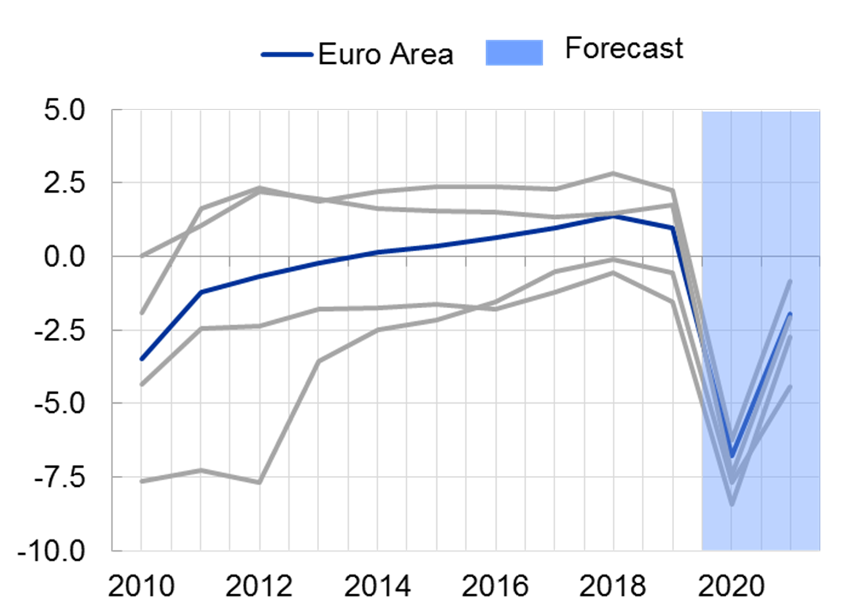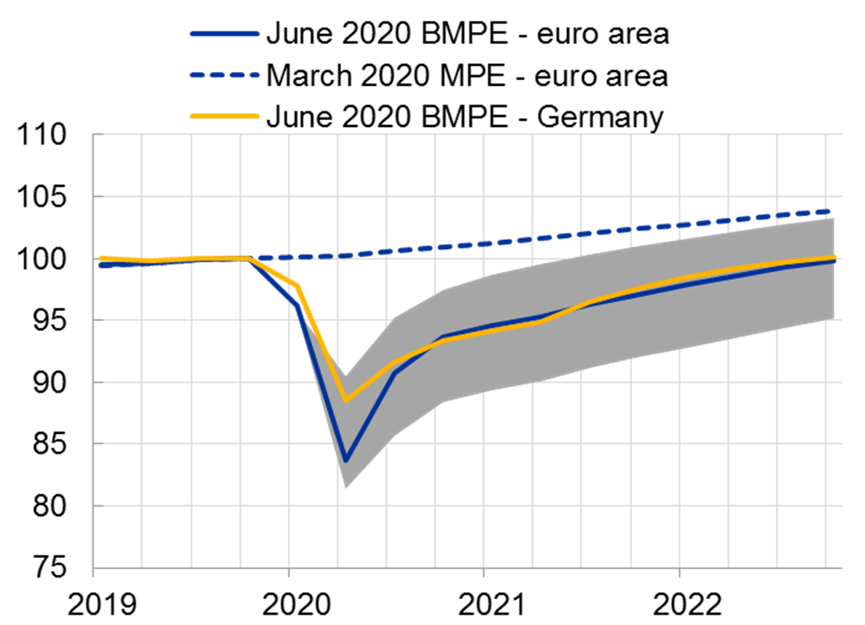 Die Corona-Krise geht mit schweren humanitären und wirtschaftlichen Auswirkungen einher. Die aktuellen Prognosen des Eurosystems gehen im Euroraum von einem Einbruch der Wirtschaftsleistung im Jahr 2020 von fast 9% aus, in Deutschland von rund 7% (Grafik 1).