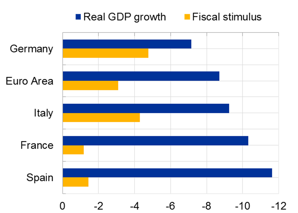 Quellen: EZB und European Commission AMECO database. Anmerkungen: Reales Wachstum bezieht sich auf die Juni Eurosystem Prognosen. Fiskalischer Stimulus berechnet sich aus der jährlichen Veränderung der primären Haushaltsbilanz, bereinigt um den Wachstumszyklus. AMECO Zahlen berücksichtigen die jüngsten Ankündigungen fiskalpolitischer Programme noch nicht