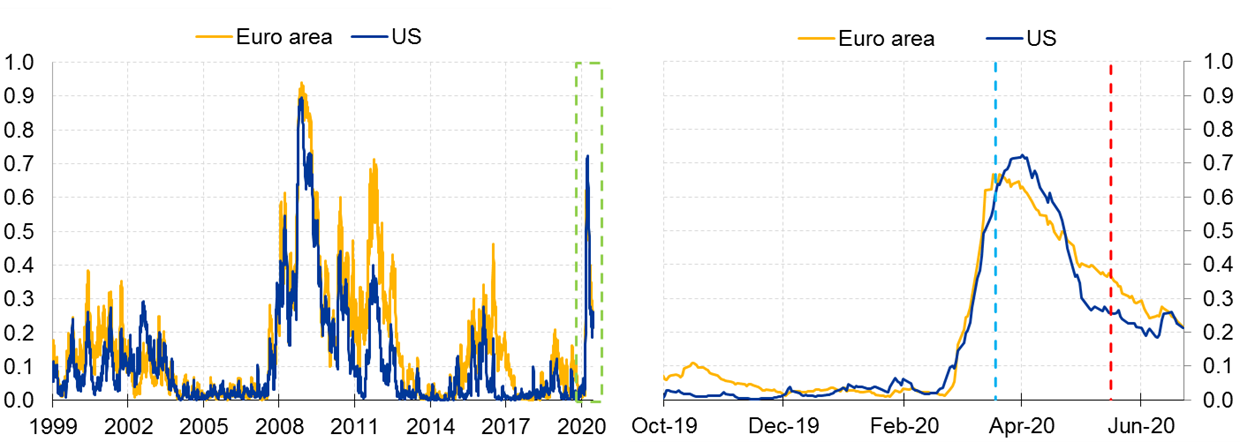 Quelle: ECB Working Paper No. 1426. Anmerkung: CISS steht für Composite Indicator of Systemic Stress (0=Kein Stress,1=Hoher Stress). Der Indikator aggregiert Stresssignale aus Geld-, Bond-, Aktien- und Wechselkursmärkten. Letzte Beobachtung: 22/06/2020