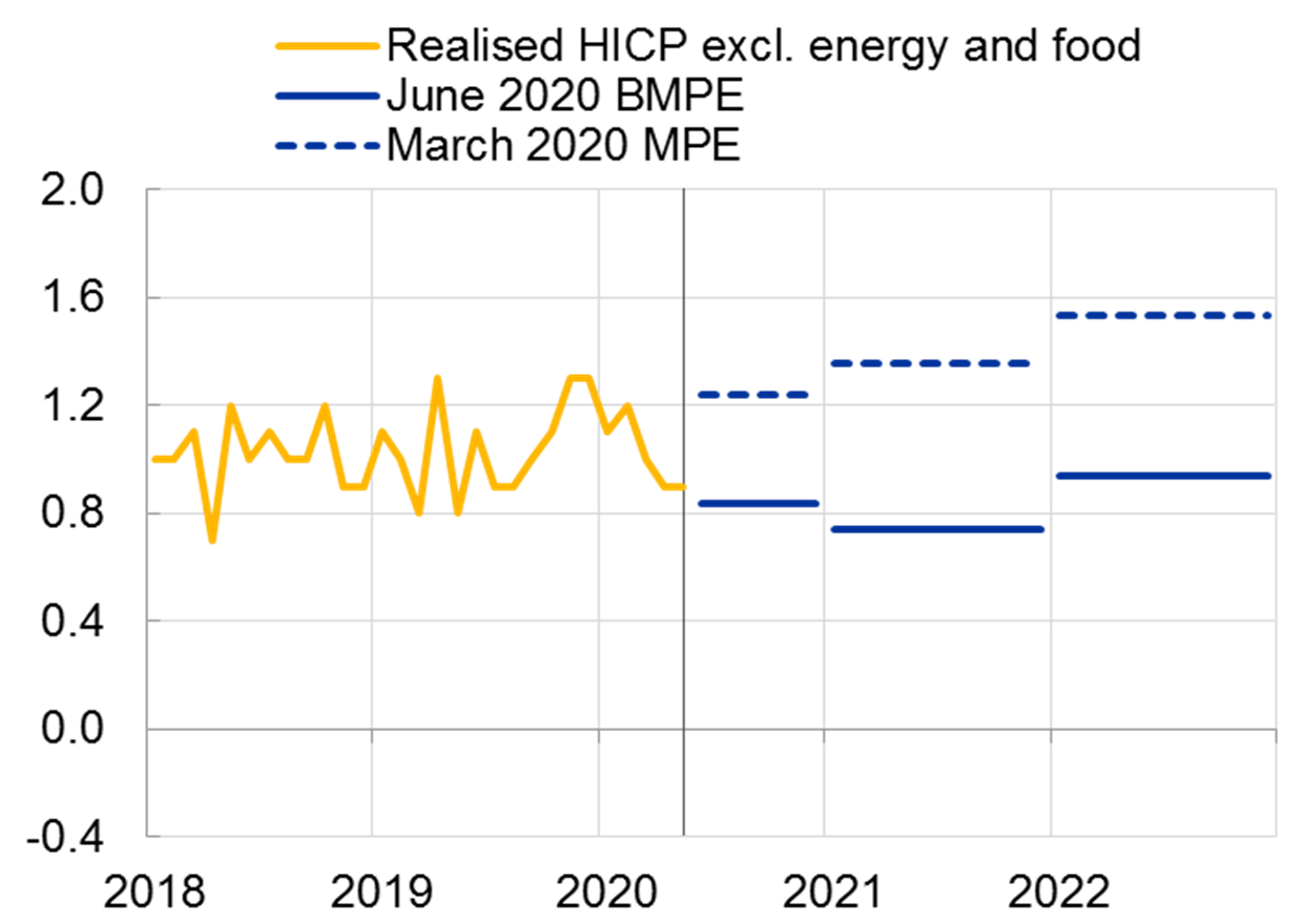 Tatsächlich ist ein bedeutender Teil der bisherigen Inflationsdynamik der Entwicklung der Ölpreise geschuldet. Allerdings sind diese selbst zu weiten Teilen eine Folge des Zusammenbruchs der weltweiten Nachfrage. Doch selbst die sogenannte Kerninflation, bei der die Preise von Lebensmitteln und Energie unberücksichtigt bleiben, wird laut den Prognosen des Eurosystems lange deutlich unter den Prognosen liegen, die noch im März vorlagen (Grafik 5).